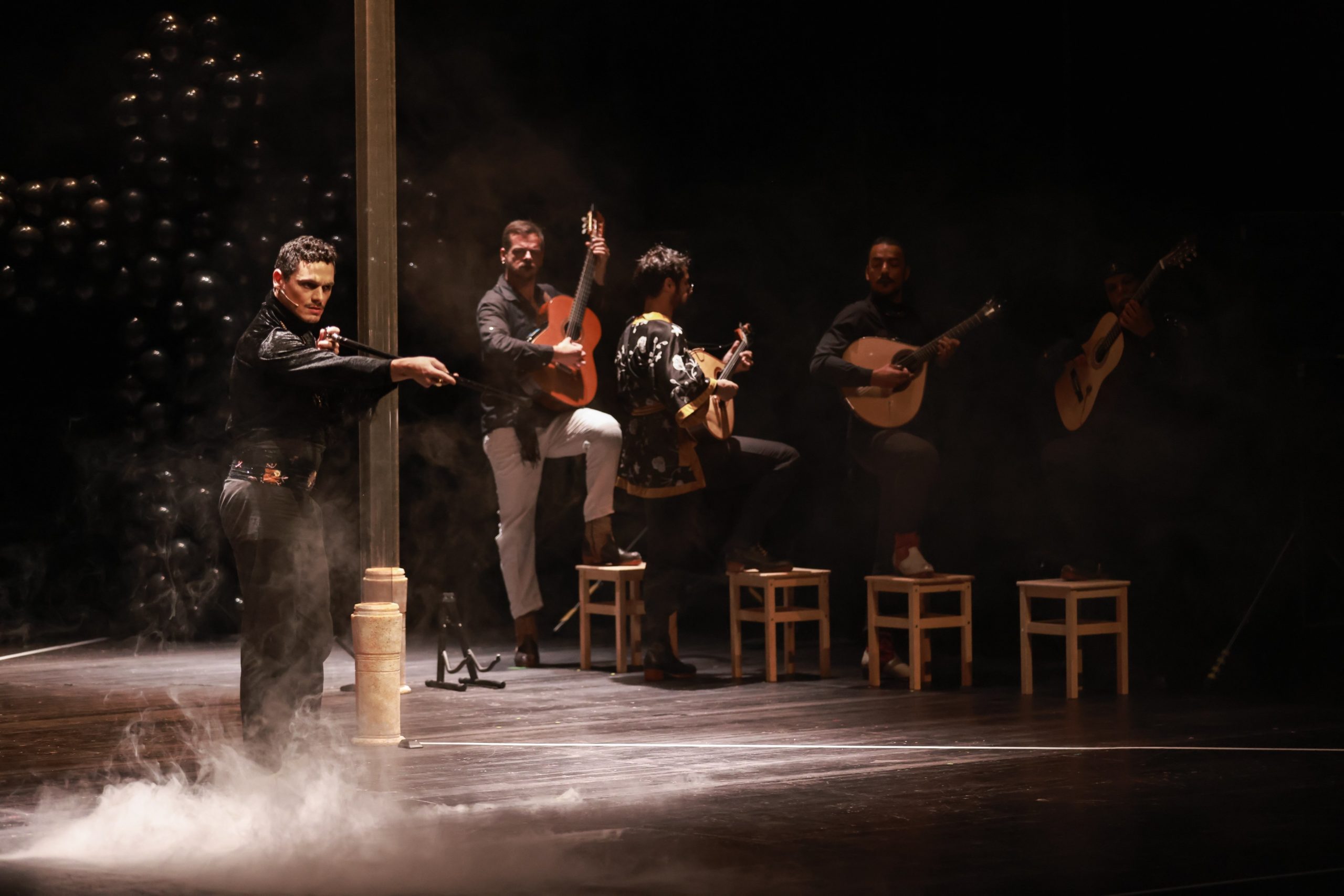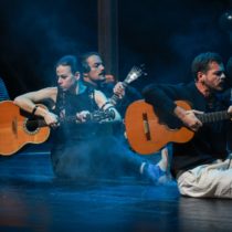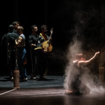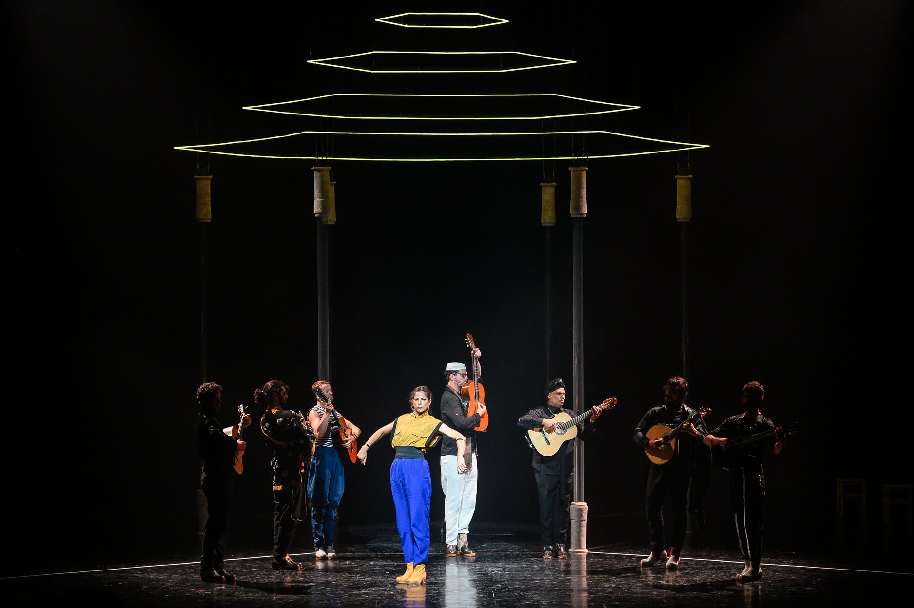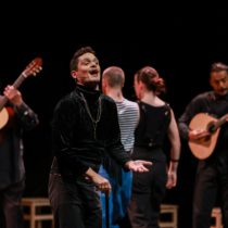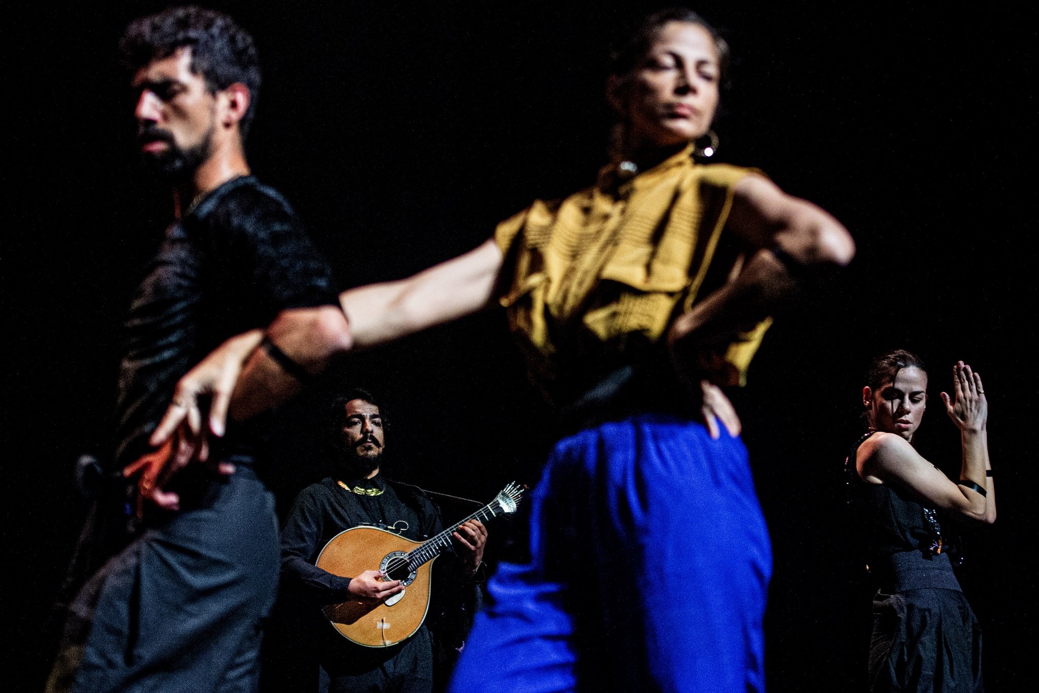 Cette performance hybride, entre danse et concert de musique est conçue pour quatre musiciens, un chanteur de fado et quatre danseurs. Le geste résonne avec la qualité d’un instrument de percussion et dialogue avec la voix et les guitares. Les artistes ne s’interdisent ni la parodie ni l’impudeur, déconstruisant l’image du fadista mâle et libérant les corps sublimés par la voix déchirante de Jonas.